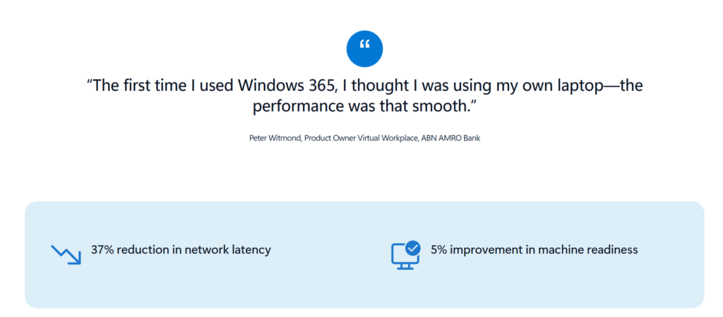 The bank chose Windows 365 for its simple design and cloud-native flexibility. With Microsoft’s support, the team could set up Cloud PCs quickly and manage them as regular laptops during a smooth, phased migration.